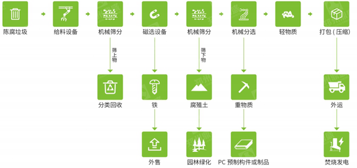 技術原理:通過機械(xiè)手段將填埋場中的陳腐垃圾挖掘(jué)出來,進行篩分、分選等處(chù)理,將其中可回(huí)收的物料進行資源化利用,而將不可回收的物料進行無害化處(chù)理。