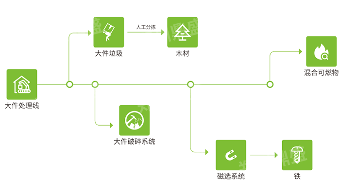 大件垃圾處(chù)理係統通過破碎、磁選、篩分、除塵等(děng)工藝(yì)流程,可以高效分選出大件垃(lā)圾中的織物、海綿、木材、鐵磁料(liào)等物料,可通過(guò)“破碎+分選”工藝快速實現(xiàn)對大件垃圾的減容和初(chū)步資源化處理,降低存放和運輸成本。也可以通過“多級破碎(suì)+多級分選”工藝實現對大件垃圾自動分類(lèi)處理,資源化利用(yòng)程度(dù)高,而且更適合混合型大件垃圾的處理。