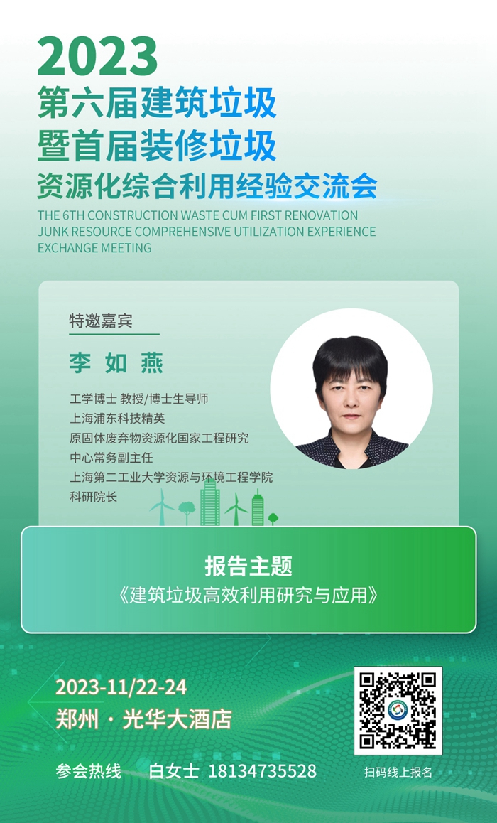 由中華環保聯合會、鄭(zhèng)州色多多免费视频企業(yè)集團聯合主辦的“第六(liù)屆建築垃(lā)圾資源化綜合利用經驗交流(liú)會”將於(yú)2023年11月22日一24日在鄭州光華大酒店召開,同(tóng)時舉辦(bàn)“首屆裝修裝潢垃圾資源化綜合利用經驗交流會”。上海第二工業(yè)大學資源與環境工程學院(yuàn)科(kē)研院長李如燕女士將蒞臨本次大會(huì)並作主題報告!