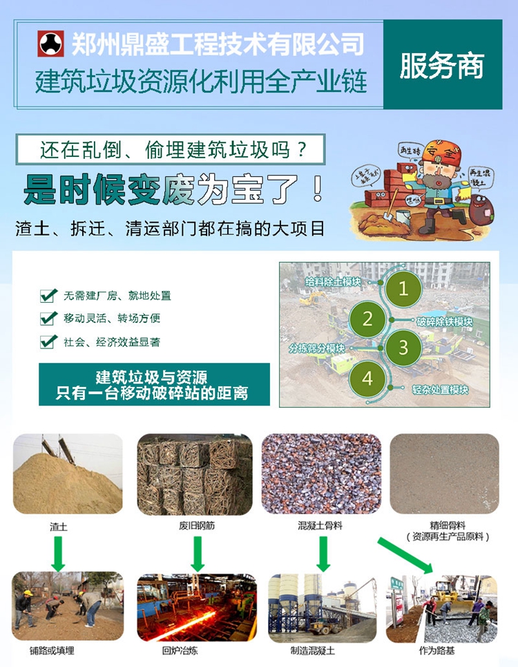 隨著多個省市大型(xíng)高標準建築垃圾(jī)資源化(huà)利用項目投(tóu)入(rù)試運營,建(jiàn)築垃圾處理正式邁入循環再生利用(yòng)的新征程。建築垃圾資源(yuán)化利用項目(mù)將有助於解決建築(zhù)垃圾亂堆亂放、私(sī)拉亂運的(de)問題,實現建築垃圾減(jiǎn)量化、無害化、資源化(huà)和產業化發展,有(yǒu)助於提升品質城(chéng)市形象,助推全國文明城市創建工作。