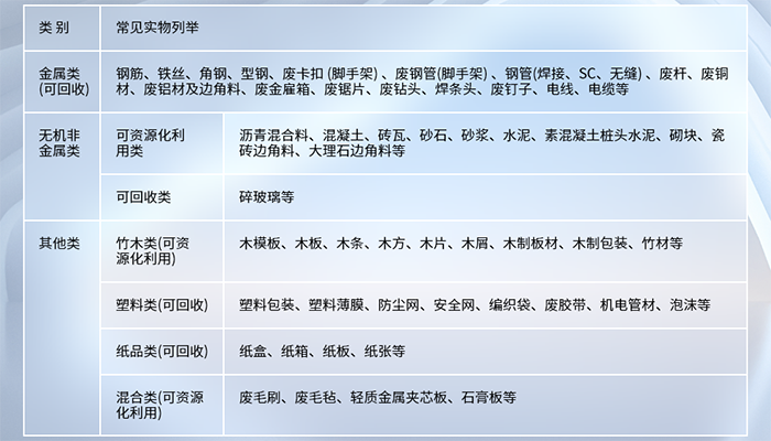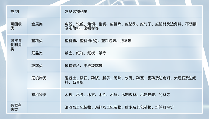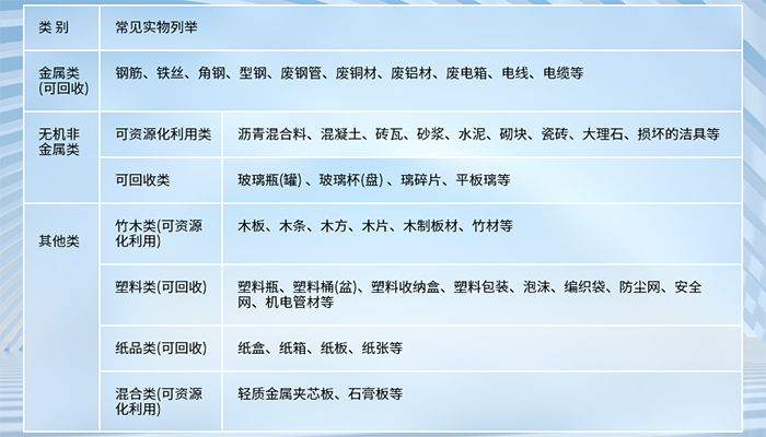 該目錄所規(guī)定的建築(zhù)垃圾,不包括工程施工或拆裝活動中產生的危險廢物、工業固體廢物、生活垃圾(含大件垃圾)。施工或(huò)拆裝現場產生的廢礦(kuàng)物油、廢塗(tú)料、廢粘合劑(jì)、廢密封劑、廢瀝青(qīng)、廢石棉、廢(fèi)電池等危險廢物,按照《國家危險廢物(wù)名錄》的規定執行;工業固體廢物按照工業固(gù)體廢物的標準規(guī)定執行;生活(huó)垃圾(含大件垃圾),按照《浙江省城鎮(zhèn)生活垃圾分類標準(zhǔn)》(DB33/T 1166-2019)的(de)規(guī)定執行。