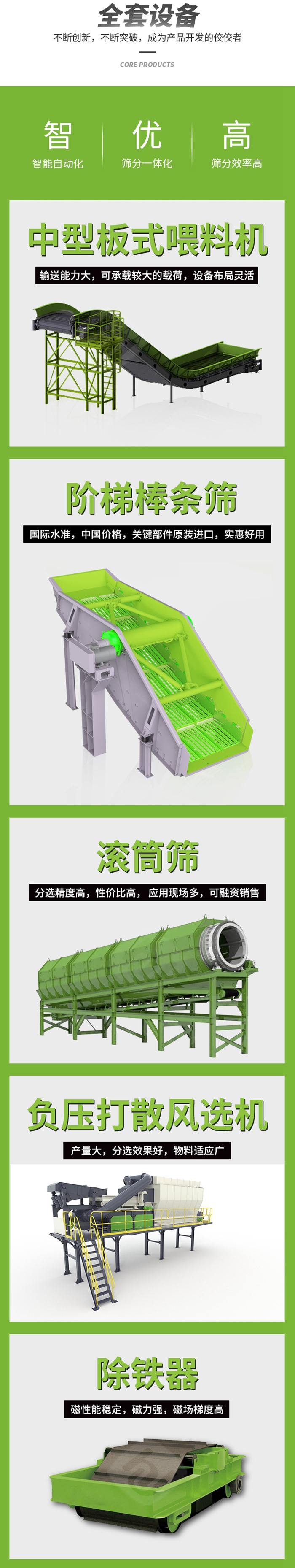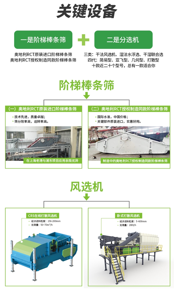 從工藝流程(chéng)可以看出裝修(xiū)垃圾分揀的關鍵設備是棒條篩和分選機(jī),我們看下色多多免费视频(shèng)公司推出的棒條篩和分選機種類。