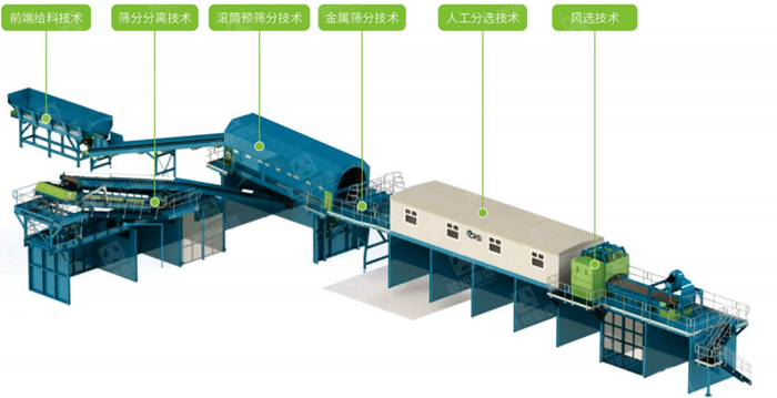 裝(zhuāng)修裝(zhuāng)潢垃圾處理係統采用“先分選後破碎,重分選而輕破碎”的工藝理(lǐ)念,避(bì)免將雜物隨物料過度破碎反而增加分選的難度。