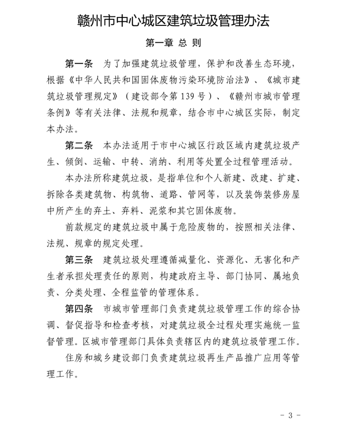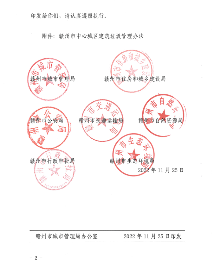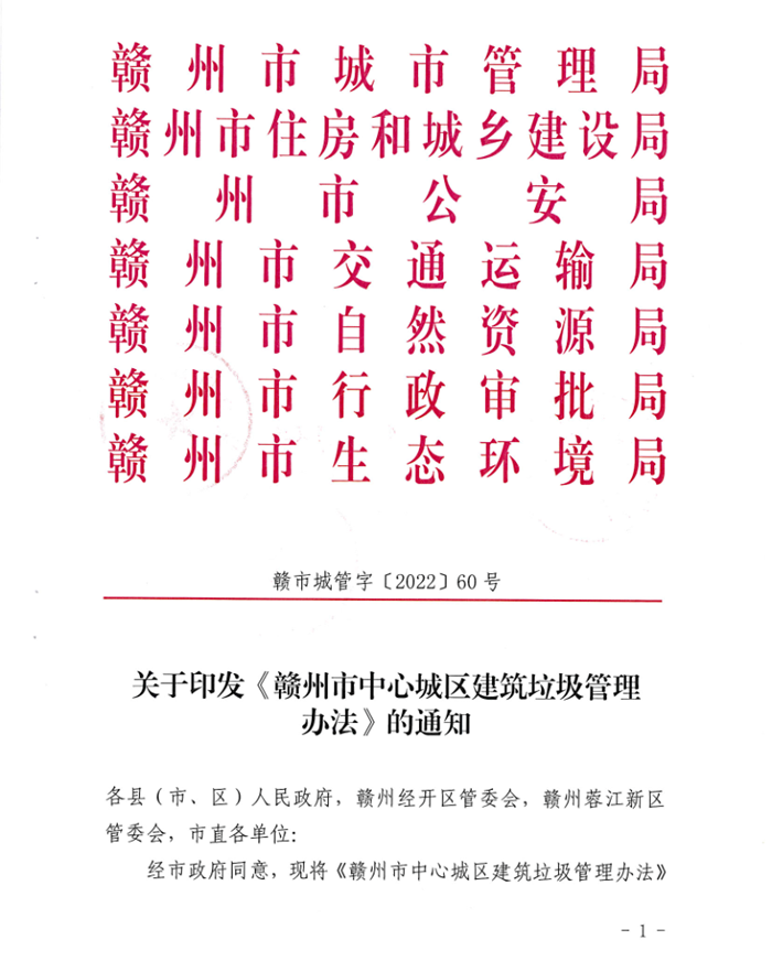 為規範市中心城區建築垃圾收(shōu)集、排放、運輸、消納和利用全(quán)過程管理,進一步提升城市環境質量,持續鞏固(gù)提升全國文明城市創建成果,近日,市城管局、市住建局、市公安局、市交通局(jú)等七部門聯合印發了《贛州市中心城區建築垃圾管理辦法》。