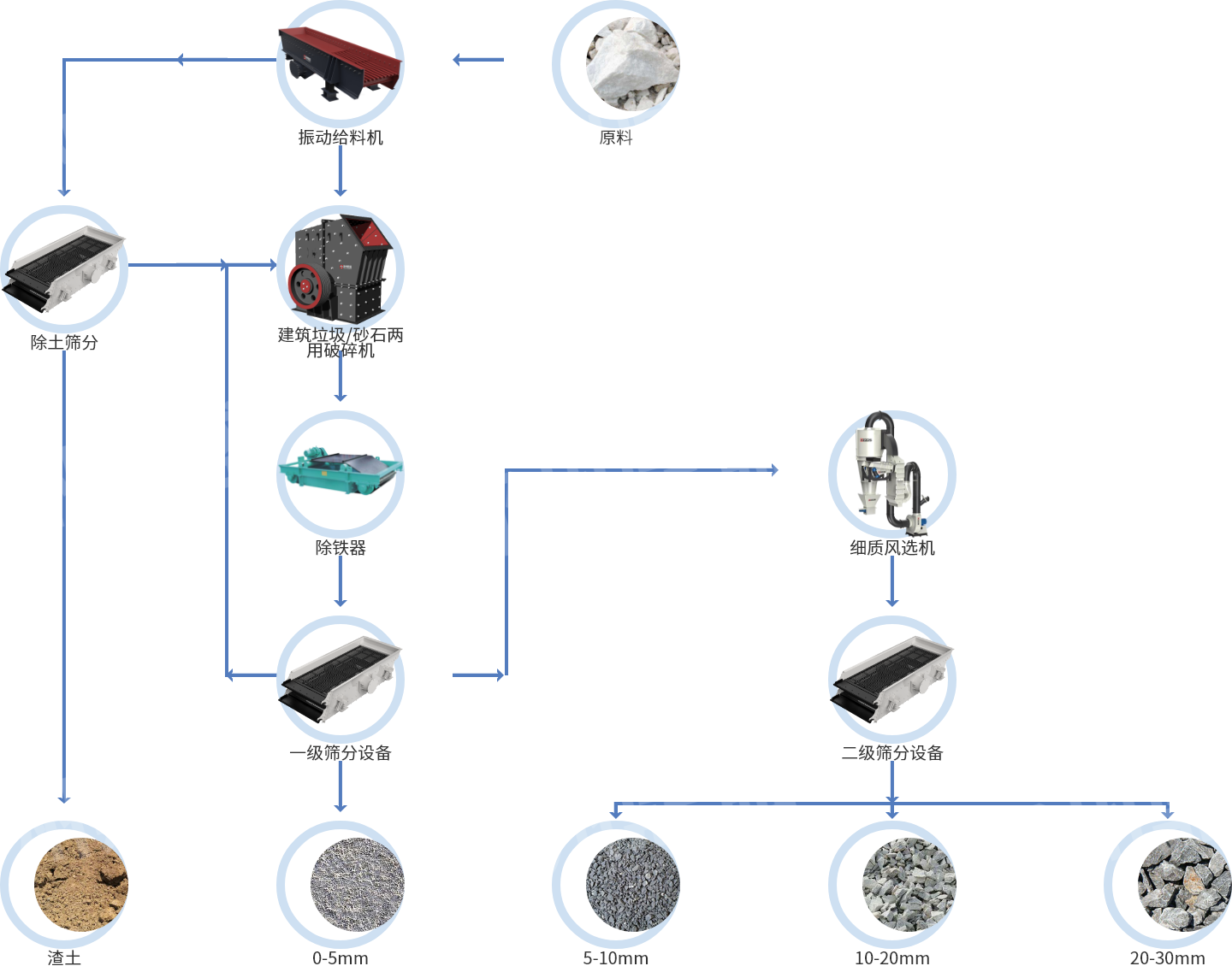 “二合一”生產線是什麽呢?該生產線是指通過專用設備、合(hé)理的工(gōng)藝(yì)布局(jú),將建築垃圾、砂石骨料處理生產(chǎn)工藝合二為一,可根(gēn)據砂石骨料的岩石特性及建築垃圾的不同構成進行(háng)靈活配置,專用設備合理搭配,輔助及工藝設備共用,處置產能不變,廠(chǎng)房占地麵積顯著(zhe)縮減,投(tóu)入成本大幅降(jiàng)低,大大提高設備運(yùn)轉率,從而創造更大的經濟效益。